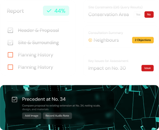 Captures the key issues during site visits. Officers can record notes by typing, handwriting, or speaking, and the system automatically structures them into the final report with no extra admin.